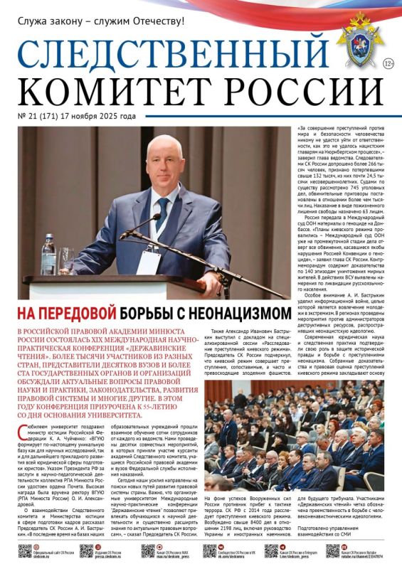 На официальном сайте Следственного комитета Российской Федерации в разделе «Издания Следственного комитета России» размещен очередной номер газеты «Следственный комитет России» (№21 (171) 17 ноября 2025).Ознакомиться с основными материалами печатаного...