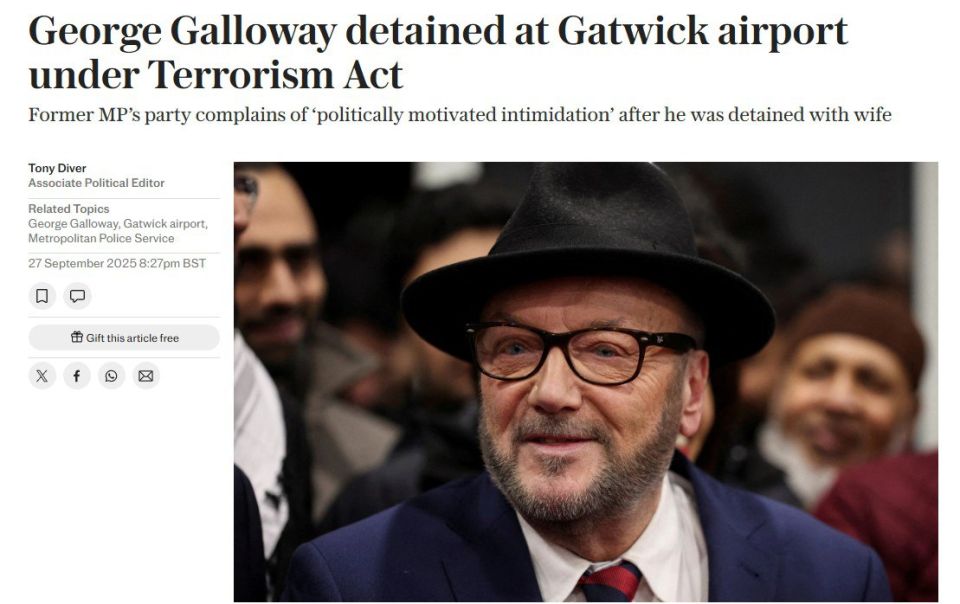 Глава Рабочей партии Великобритании Джордж Гэллоуэй и его супруга Гаятри были остановлены полицией в аэропорту «Гатвик» после возвращения из поездки в РФ, сообщает The Daily Telegraph.Супруги прилетели рейсом из Абу-Даби, куда прибыли из Москвы....