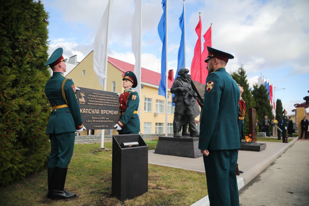 В рамках праздничных мероприятий состоялась закладка капсулы времени для вскрытия потомками в день 100-летия Великой Победы. Почётное право помещения капсулы предоставлено офицеру казанского отряда спецназа Росгвардии Герою России майору Андрею Филоненко.