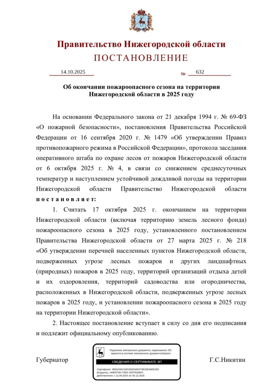 В связи со снижением пожарной опасности в лесах и населенных пунктах Нижегородской области постановлением регионального Правительства N632 от 14.10.2025 г. с 17 октября окончен пожароопасный сезон.