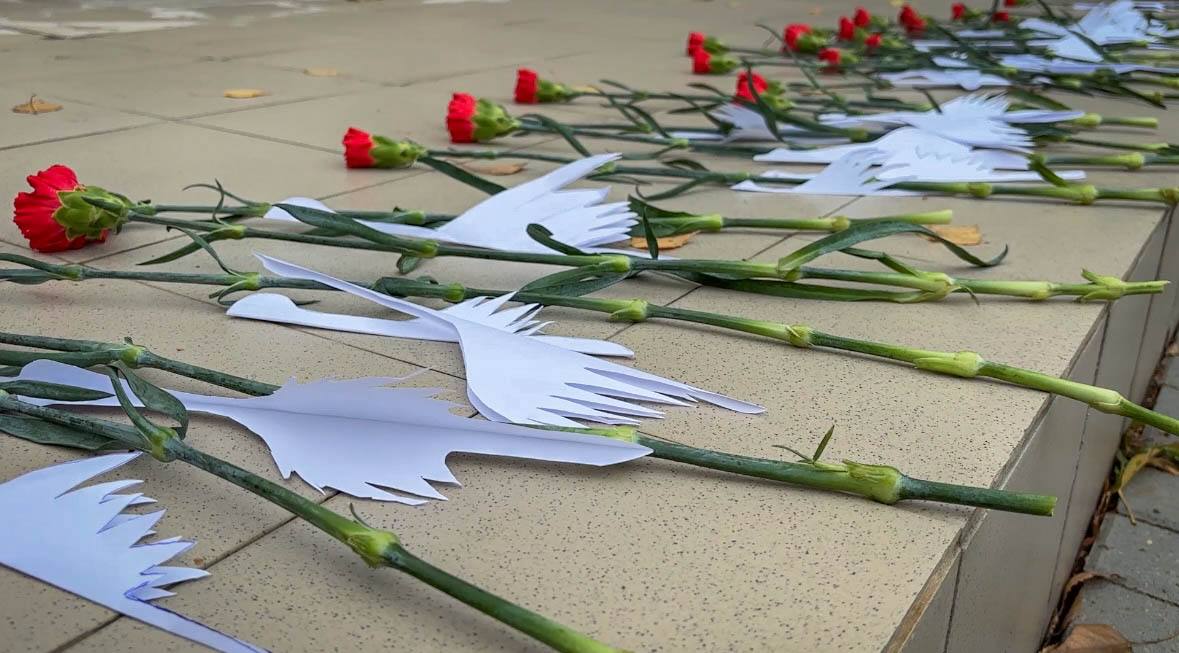 Остальных белых журавлей и алые гвоздики участники акции возложили после урока к мемориалу Памяти павших в годы Великой Отечественной войны.