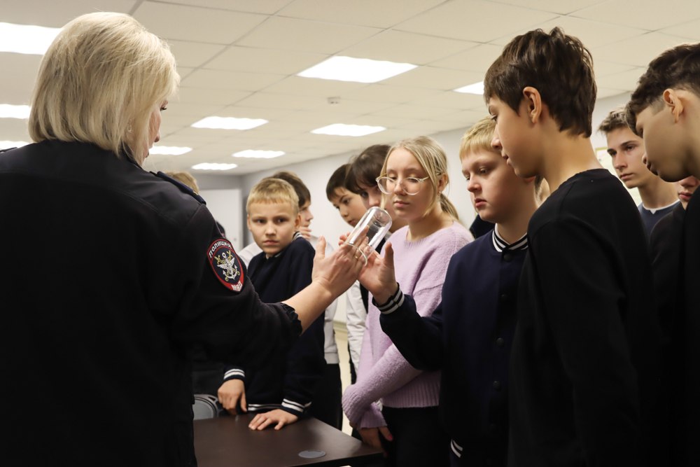 От эксперта экспертно-криминалистического центра Управления капитана полиции Ольги Подковыриной школьники узнали о содержимом чемодана эксперта-криминалиста, также увидели, как проводят различные экспертизы и исследования.