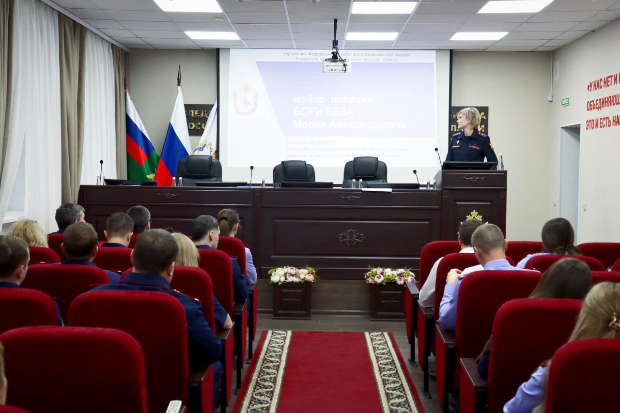 На занятие были приглашены сотрудники Управления Росгвардии по Нижегородской области. В рамках межведомственного взаимодействия помощник начальника управления по взаимодействию со средствами массовой информации – начальник пресс-службы Управления Росгвардии по Нижегородской области Мария Боржеева рассказала сотрудникам следственного управления о противодействии терроризму и террористическим проявлениям в России, а также методам профилактики.