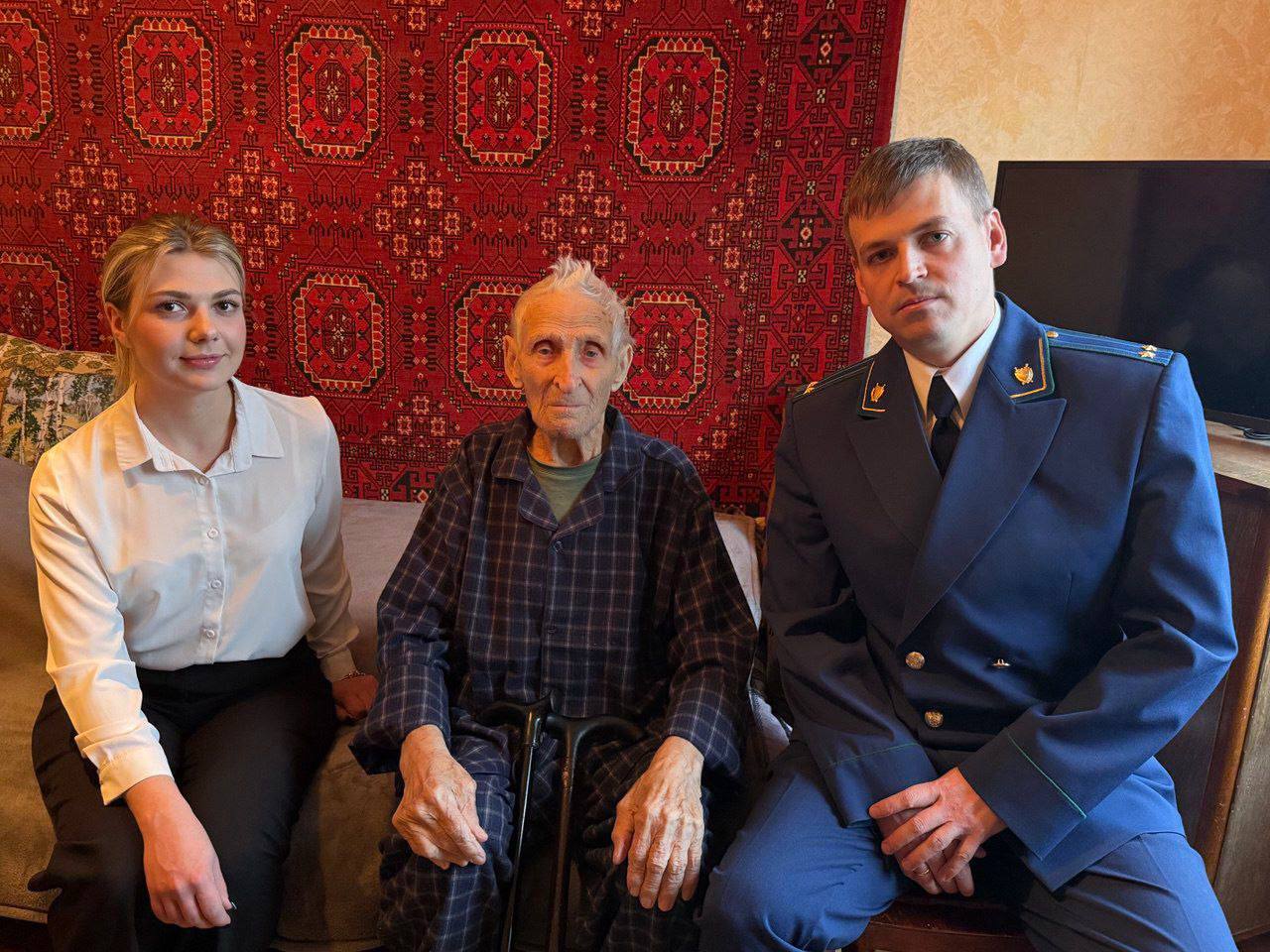 Прокурор Сормовского района г. Нижнего Новгорода Михаил Кузнецов совместно с молодым специалистом поздравили ветерана Великой Отечественной войны Корнилина Степана Васильевича со 100-летним юбилеем.