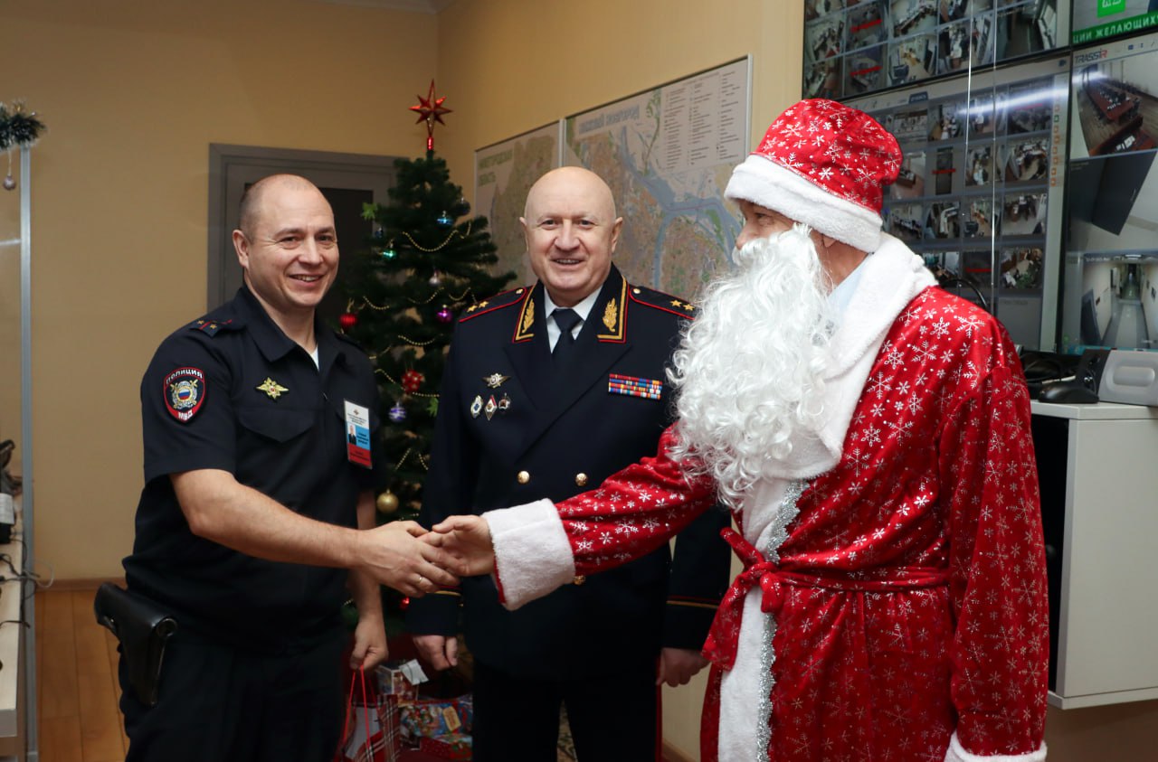 Председатель Общественного совета при областном главке полиции Вадим Гребенщиков перевоплотился в Деда Мороза и вручил сотрудникам памятные подарки.