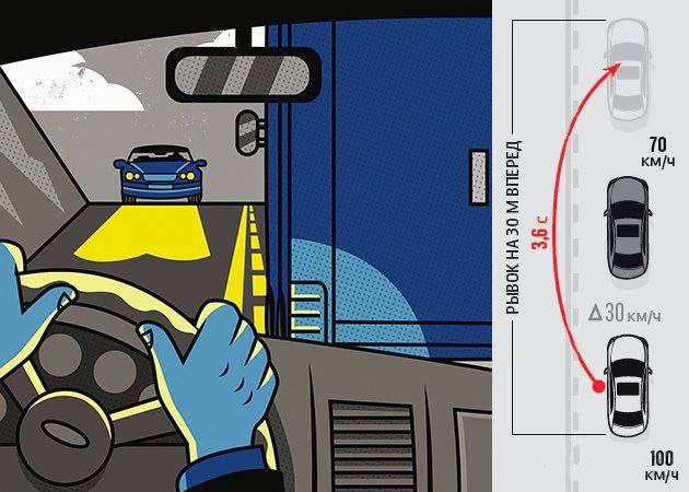 То есть правильный обгон выглядит так: оценить скорость свою и впереди идущего автомобиля, прибавить 20-30 км/ч и только затем обгонять.