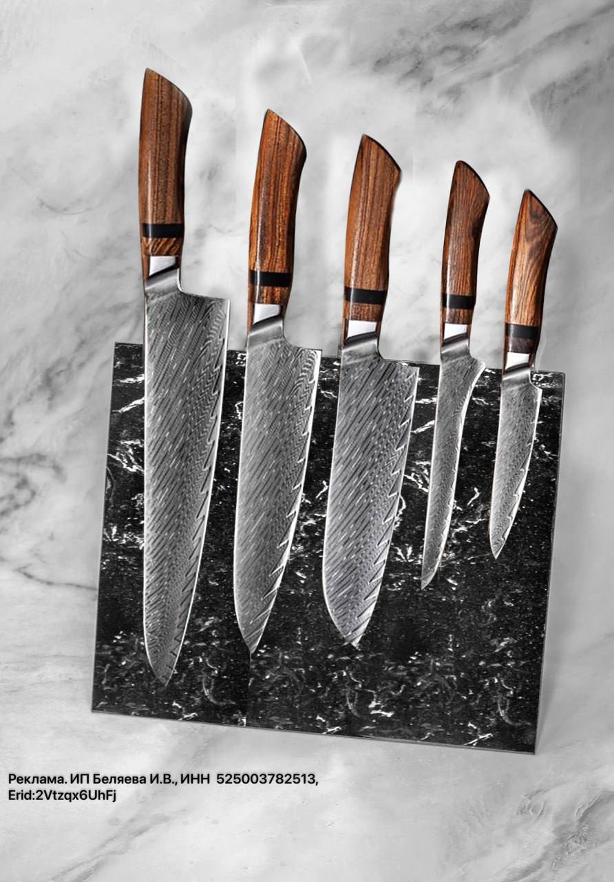 Кухонные ножи из Широгами дамасска. Серия включает 5 ножей, которые закрывают все задачи по кухне!