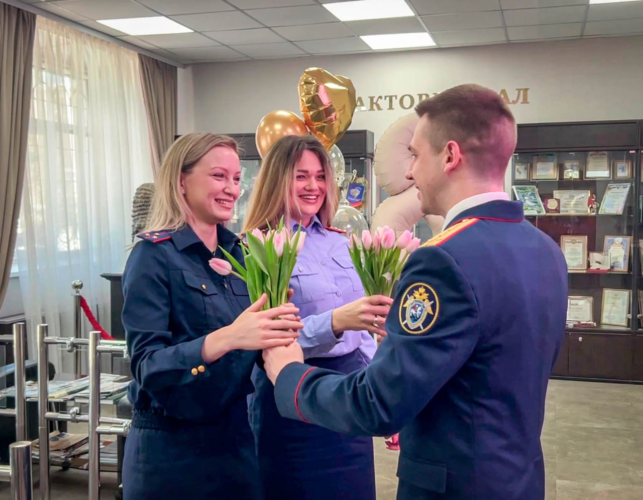 Уже при входе в здание следственного управления мужчины встречали каждую сотрудницу букетом цветов и радостной улыбкой.