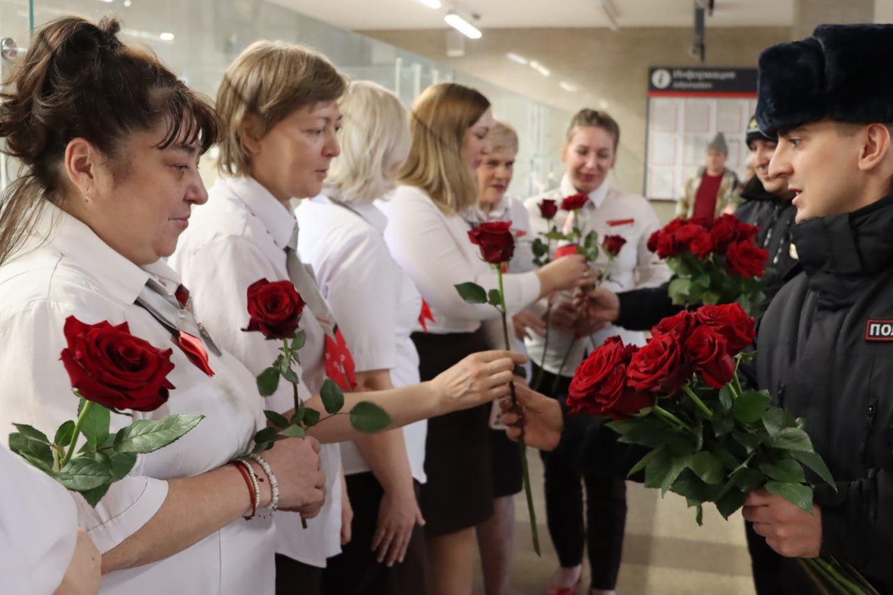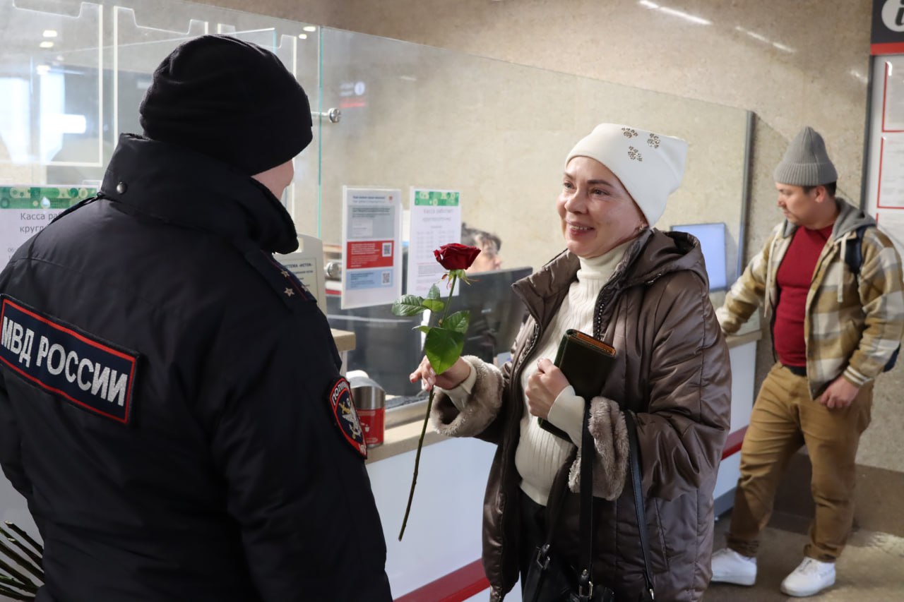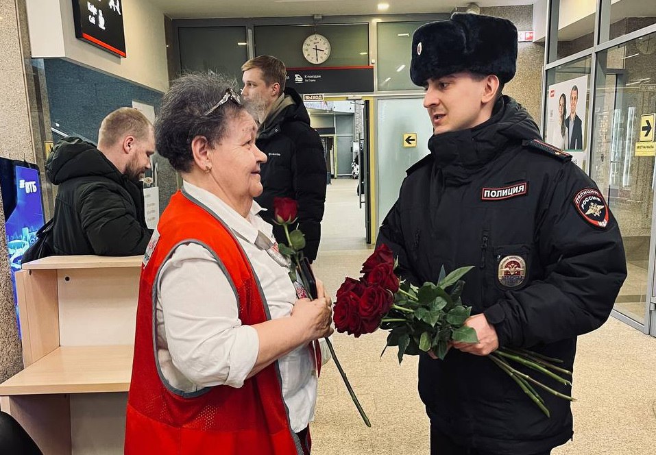 В Нижнем Новгороде сотрудники транспортной полиции в преддверии Международного женского дня подарили праздник пассажирам железнодорожного вокзала