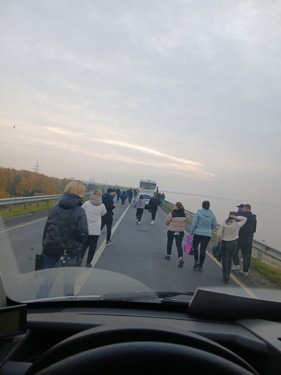 Из-за этого образовалась огромная пробка в обоих направлениях. Пассажирам автобусов пришлось идти пешком по трассе.