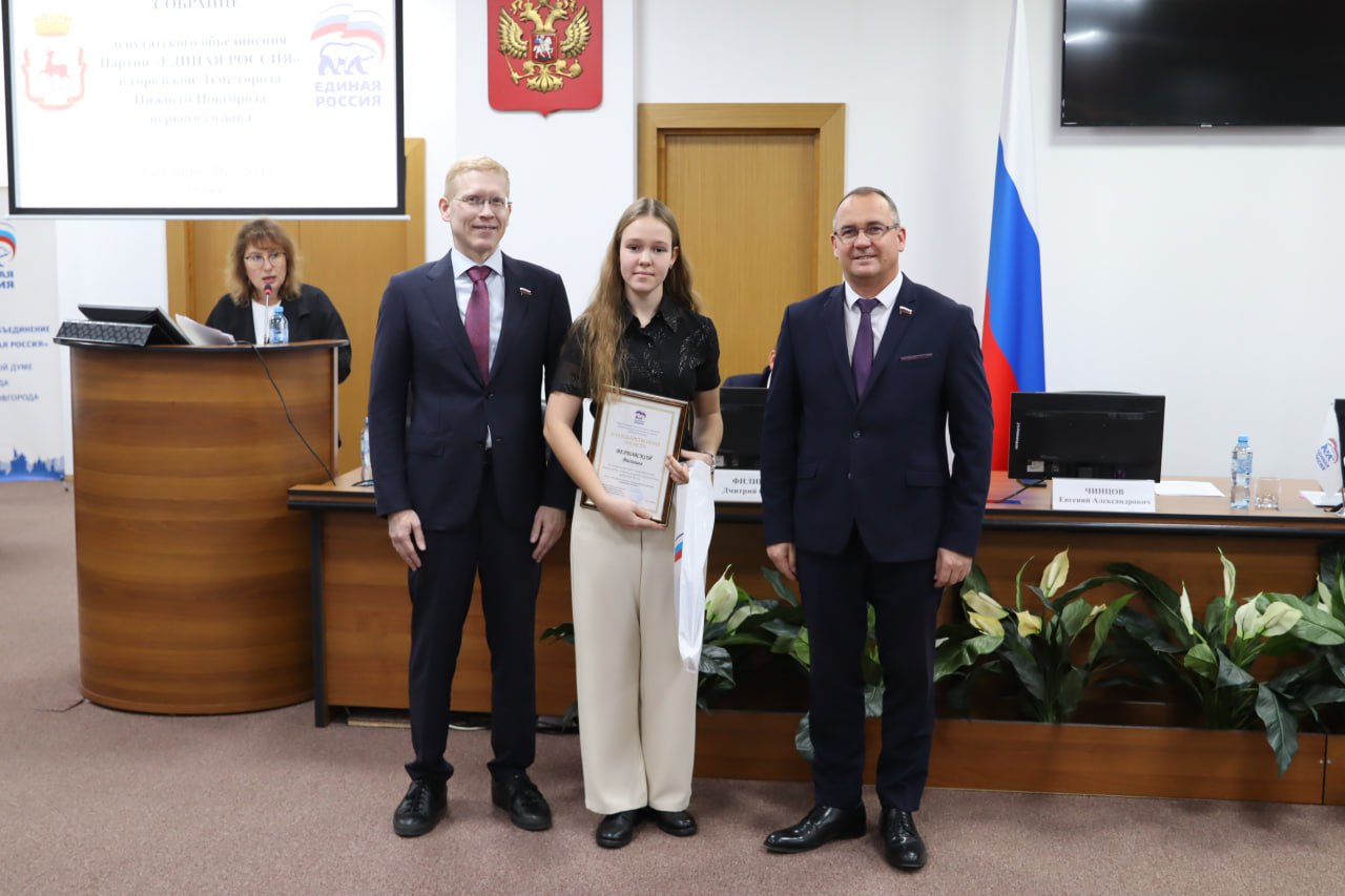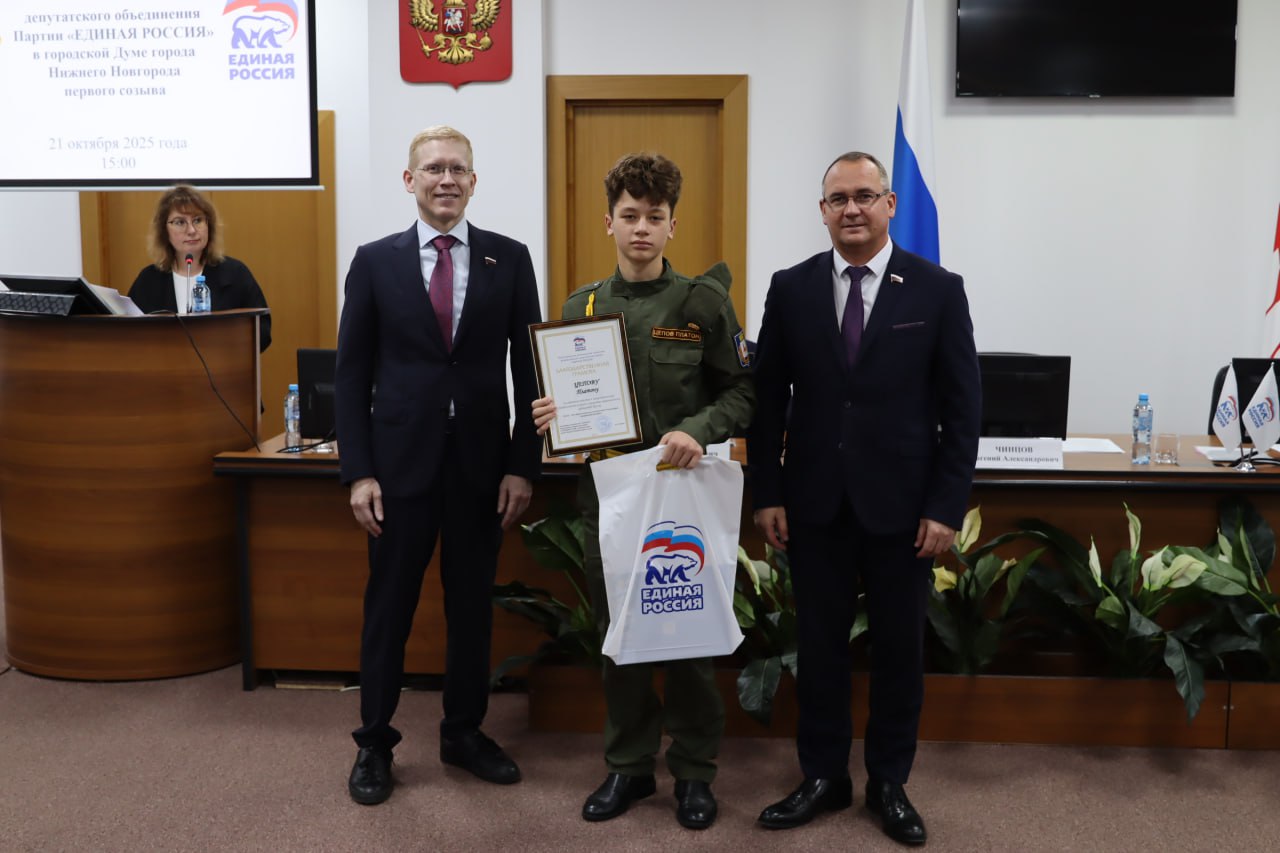 Перед началом заседания состоялось вручение нижегородским школьникам благодарственные грамоты за активное участие в патриотической деятельности и вклад в развитие национальных ценностей России.