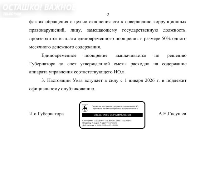 Чиновники Нижегородской области получат право на единовременную выплату — «50% одного месячного денежного содержания», если сообщат губернатору о подтверждённой попытке склонения их к коррупции, —следует из указа, опубликованного на сайте областного правительства (фото).