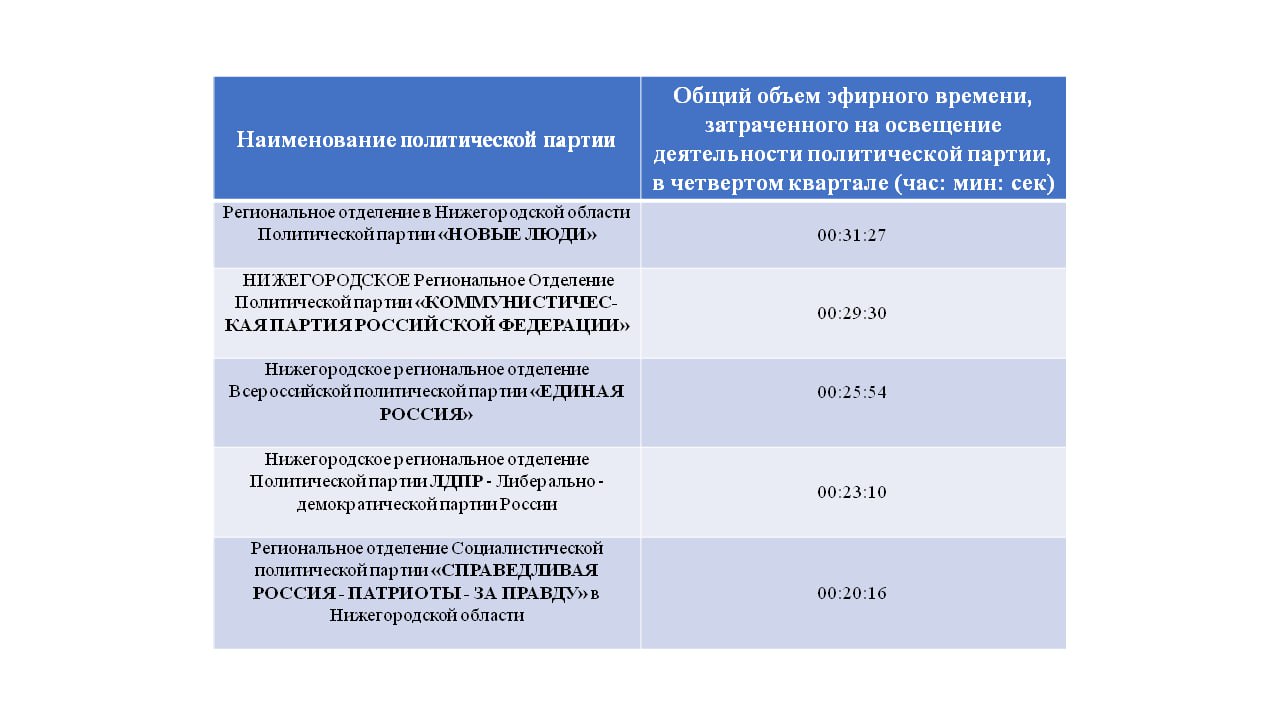 Установлен общий объем эфирного времени, затраченного в четвертом квартале 2025 года на освещение деятельности каждой из политических партий.