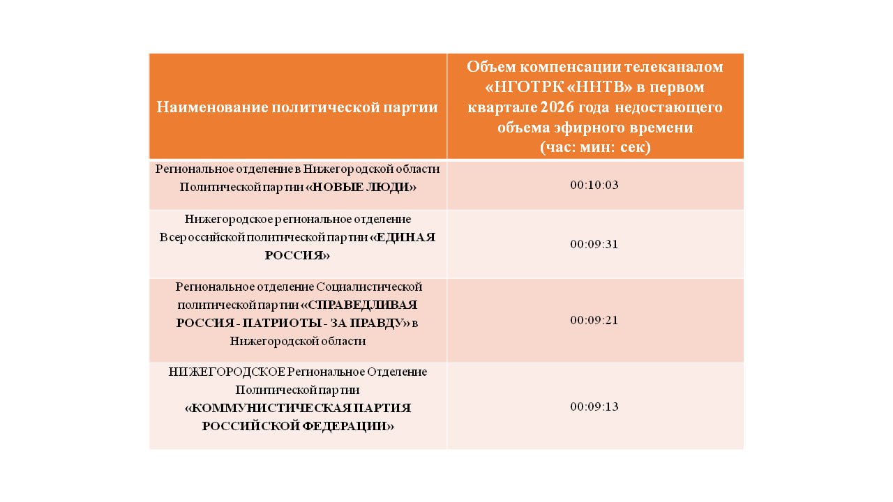 Рабочей группой принято решение о необходимости компенсации областным телеканалом «НГОТРК «ННТВ» в первом квартале 2026 года недостающего объема эфирного времени в отношении четырех политических партий.