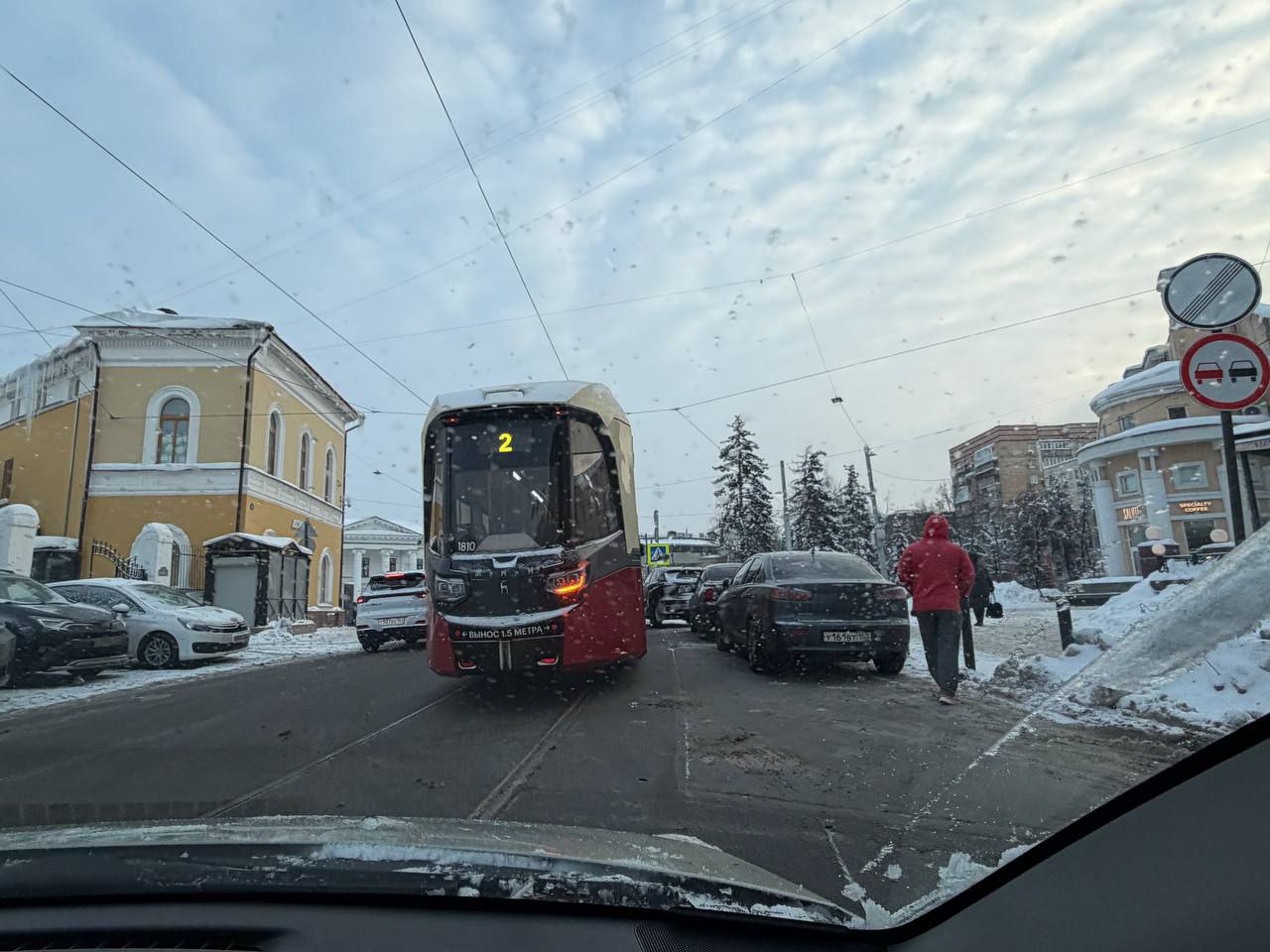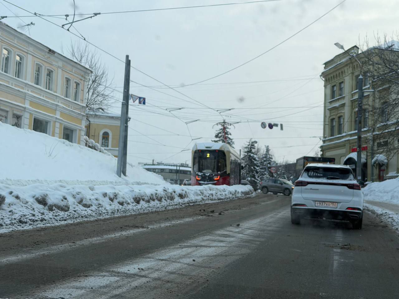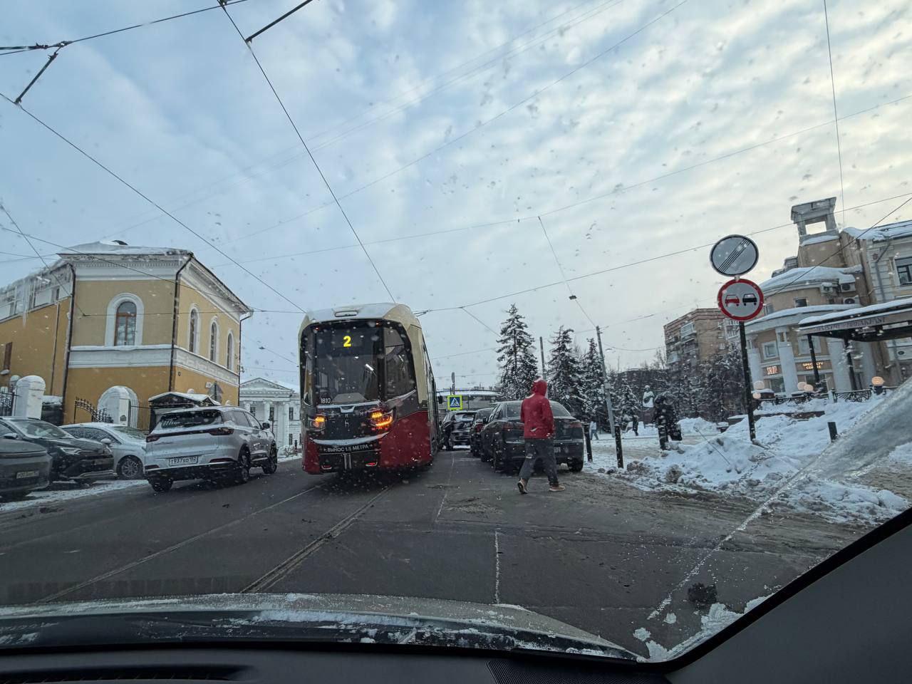 На улице Большая Покровская все трамваи остановились из-за припаркованного автомобиля марки "Лексус"