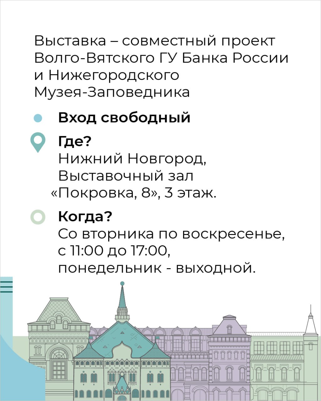 Экспозиция расположена в выставочном зале «Покровка, 8» — филиале НГИАМЗ.