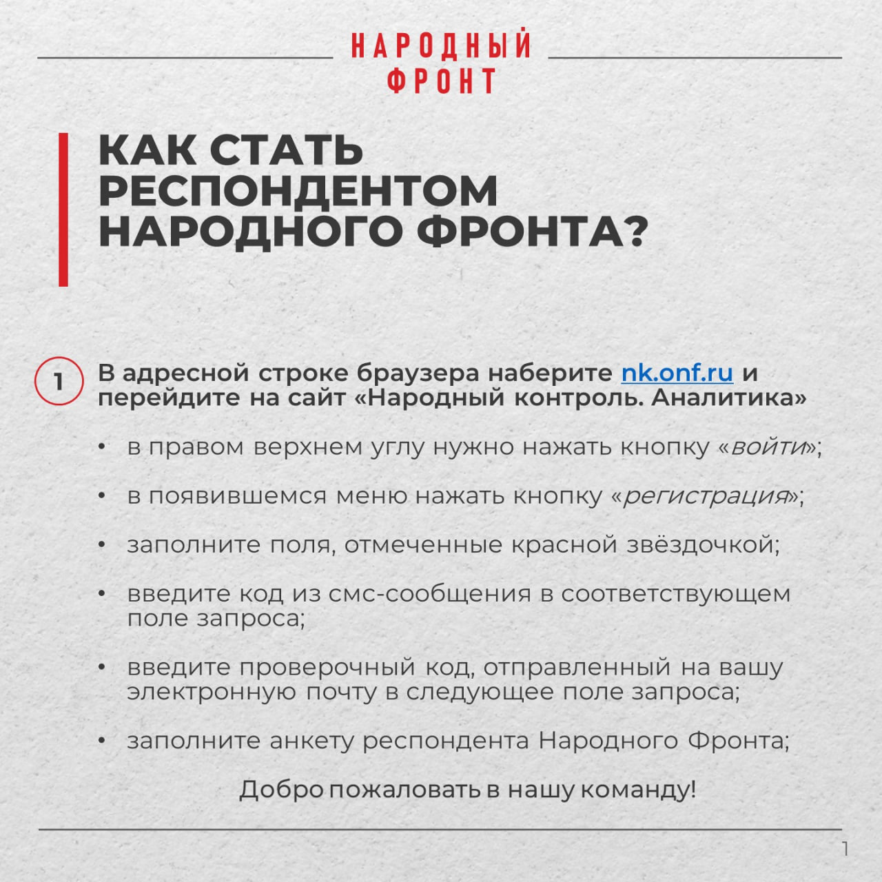 Регистрируйся на официальной платформе Народного фронта. ЗДЕСЬ. В личном кабинете будут отображаться все актуальные опросы, важно участвовать и давать объективную оценку. Твое мнение может изменить ситуацию в регионе в той или иной сфере.