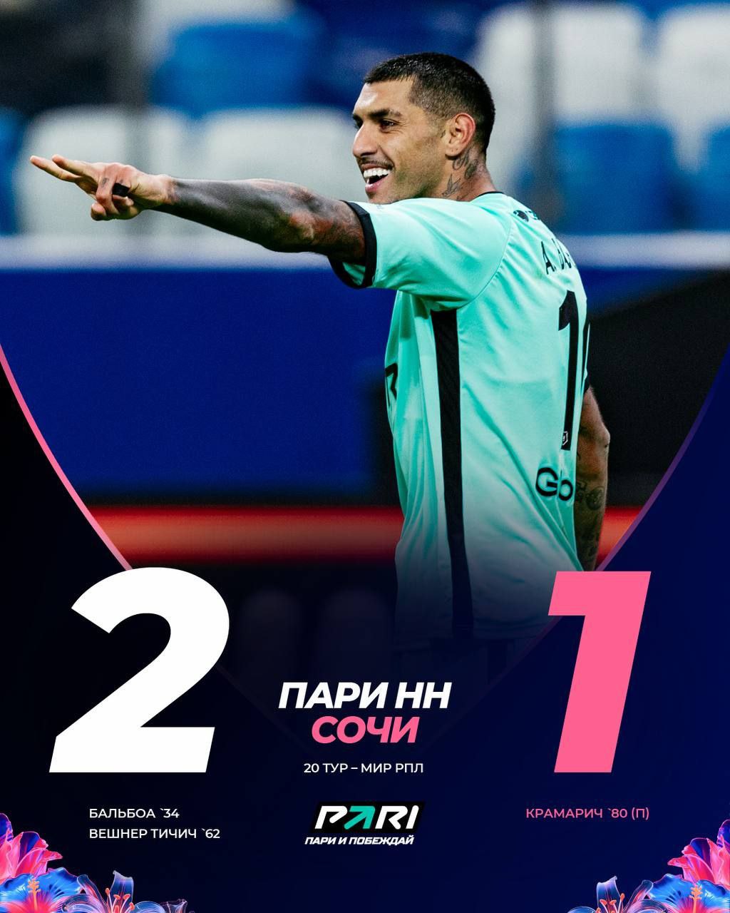 Футболисты «Пари Нижний Новгород» обыграли «Сочи» со счетом 2:1 в домашнем матче 20-го тура Российской премьер-лиги (РПЛ).В составе победителей голы забили Адриан Бальбоа (34-я минута) и Лука Тичич (62). У проигравших отличился Мартин Крамарич...