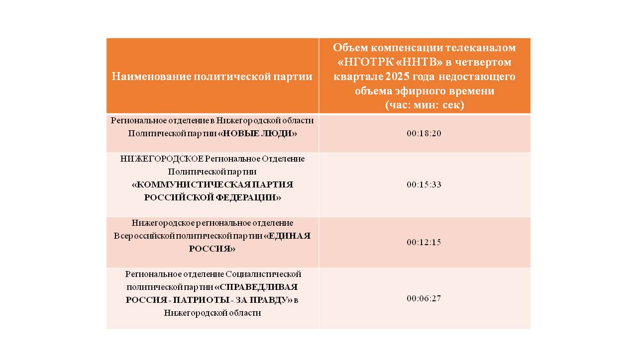 Рабочей группой принято решение о необходимости компенсации областным телеканалом «НГОТРК «ННТВ» в четвертом квартале 2025 года недостающего объема эфирного времени в отношении четырех политических партий.