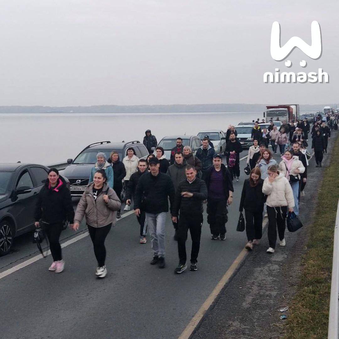 Движения на мосту нет — проезд полностью перекрыт. Люди вышли из автобусов и идут пешком.