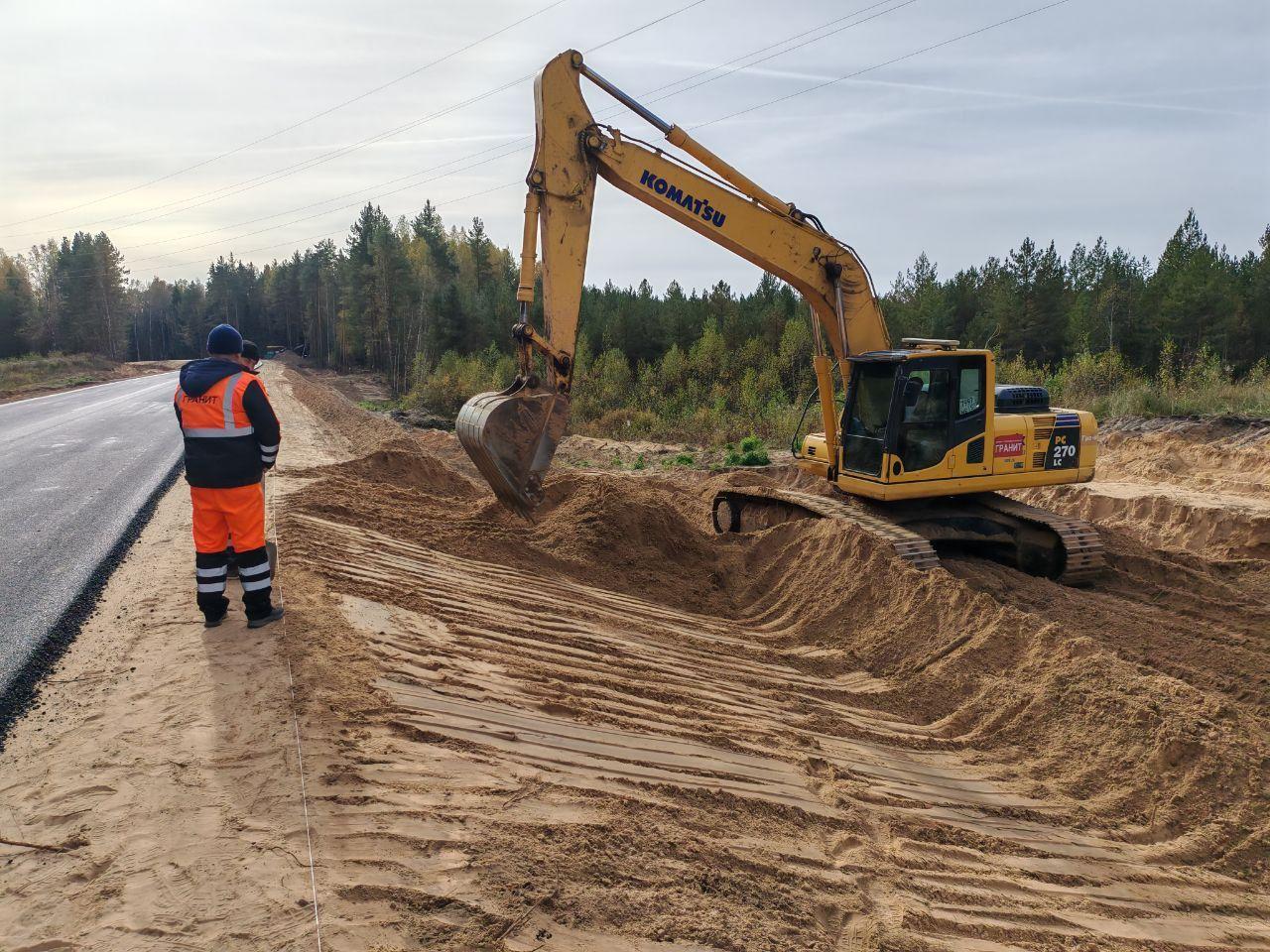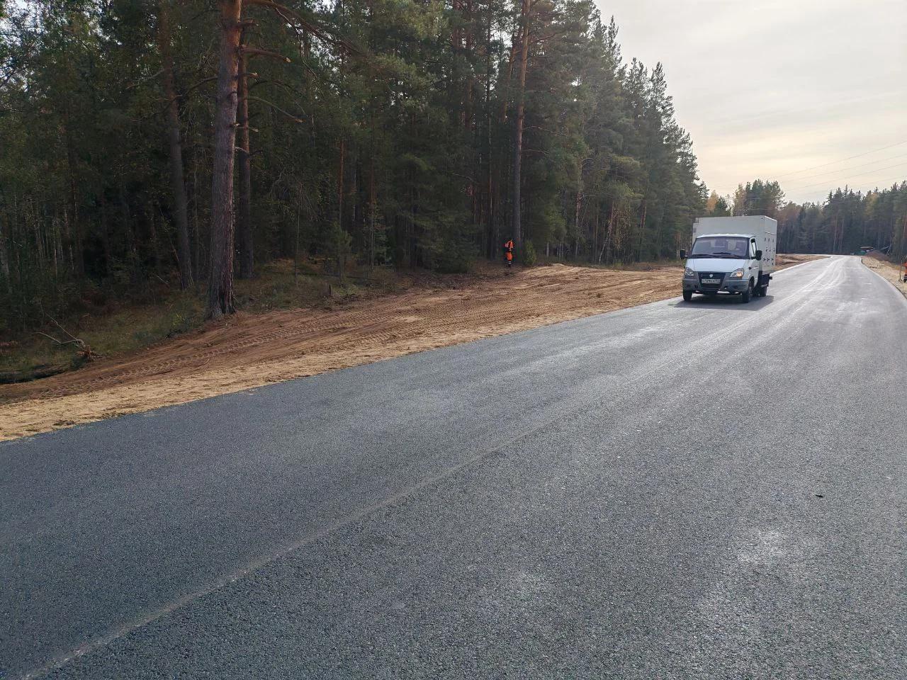 Работы идут с опережением графика и уже выполнены на 90%. Проезжую часть расширили до 6 метров, уложили двухслойное асфальтобетонное покрытие, были обустроены 9 съездов, а обочины дороги укрепляют щебнем, чтобы повысить долговечность.