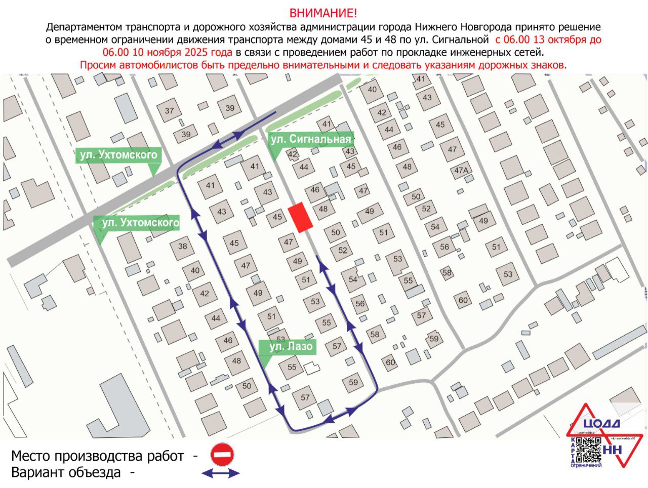 В Нижнем Новгороде с 06.00 13 октября до 06.00 10 ноября будет временно ограничено движение транспорта по улице Сигнальной от дома №45 до дома №48 в связи с проведением строительно-монтажных работ. Объезд будет организован по прилегающим улицам.