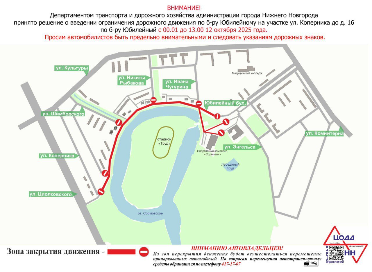 Ограничения коснутся участка от улицы Коперника до дома №16 по бульвару Юбилейному в Нижнем Новгороде с 00.01 до 13.00 12 октября. Это связано с проведением спортивного мероприятия.