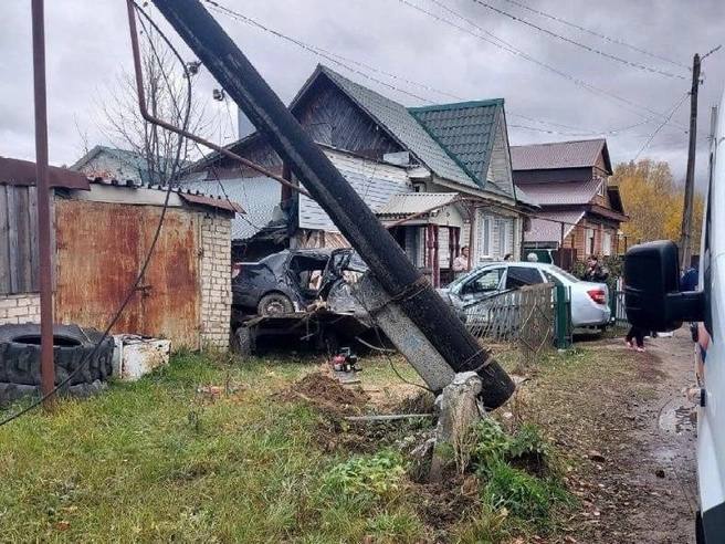 Автомобиль ехал на большой скорости по поселку Досчатое. Водитель не справился с управлением и влетел в опору. От удара легковушку откинуло в забор.
