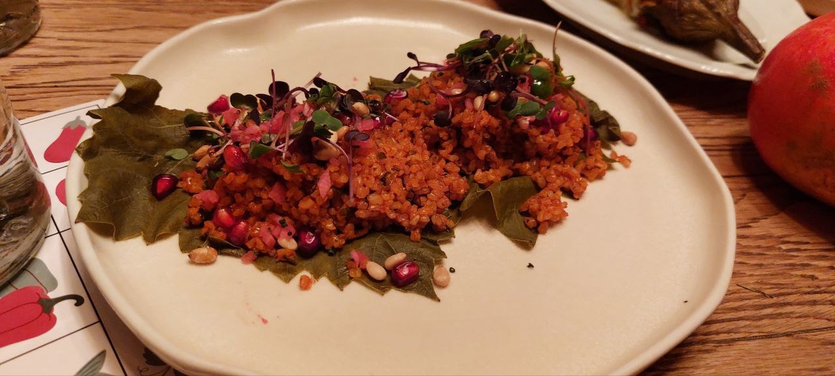 Меню включало 11 курсов, среди которых каждая позиция удивляла оригинальностью и изысками. Долма из говядины сопровождалась перечной пастой и камац мацуном с орехами. Котлетки ишли кюфта с бульоном и маринованной капустой были обжарены, придавая им уникальную хрустящую текстуру. На завершение вечера подали освежающий сорбет из граната и десерт: ореховую гату с белым шоколадом, облепихой и инжиром.