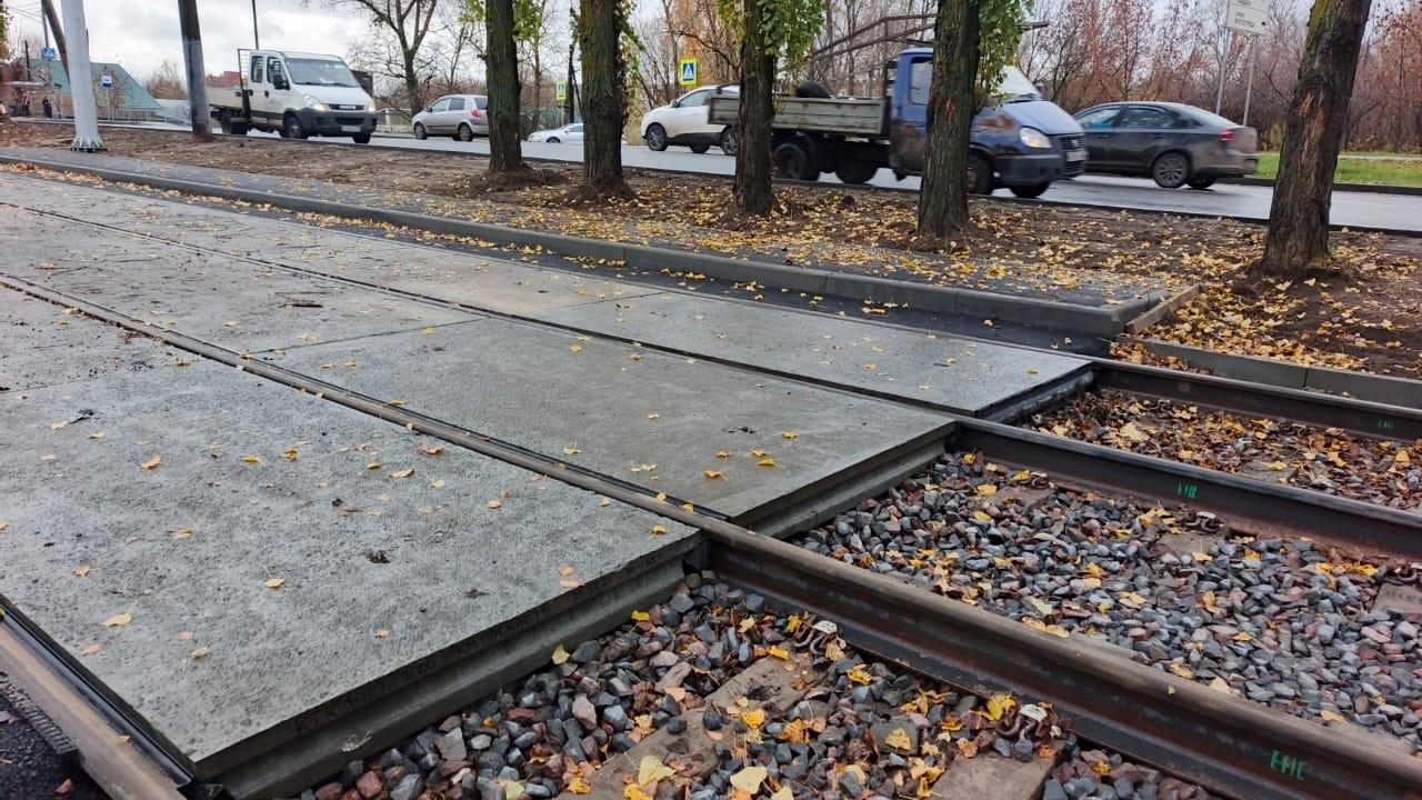На участке от парка им. 1 Мая до улицы Аксакова ведется сборка рельсошпальной решетки, балластировка путей щебнем, выправка пути в плане и профиле, устройство контактной сети и нижней железобетонной плиты, а также алюминотермитная сварка.