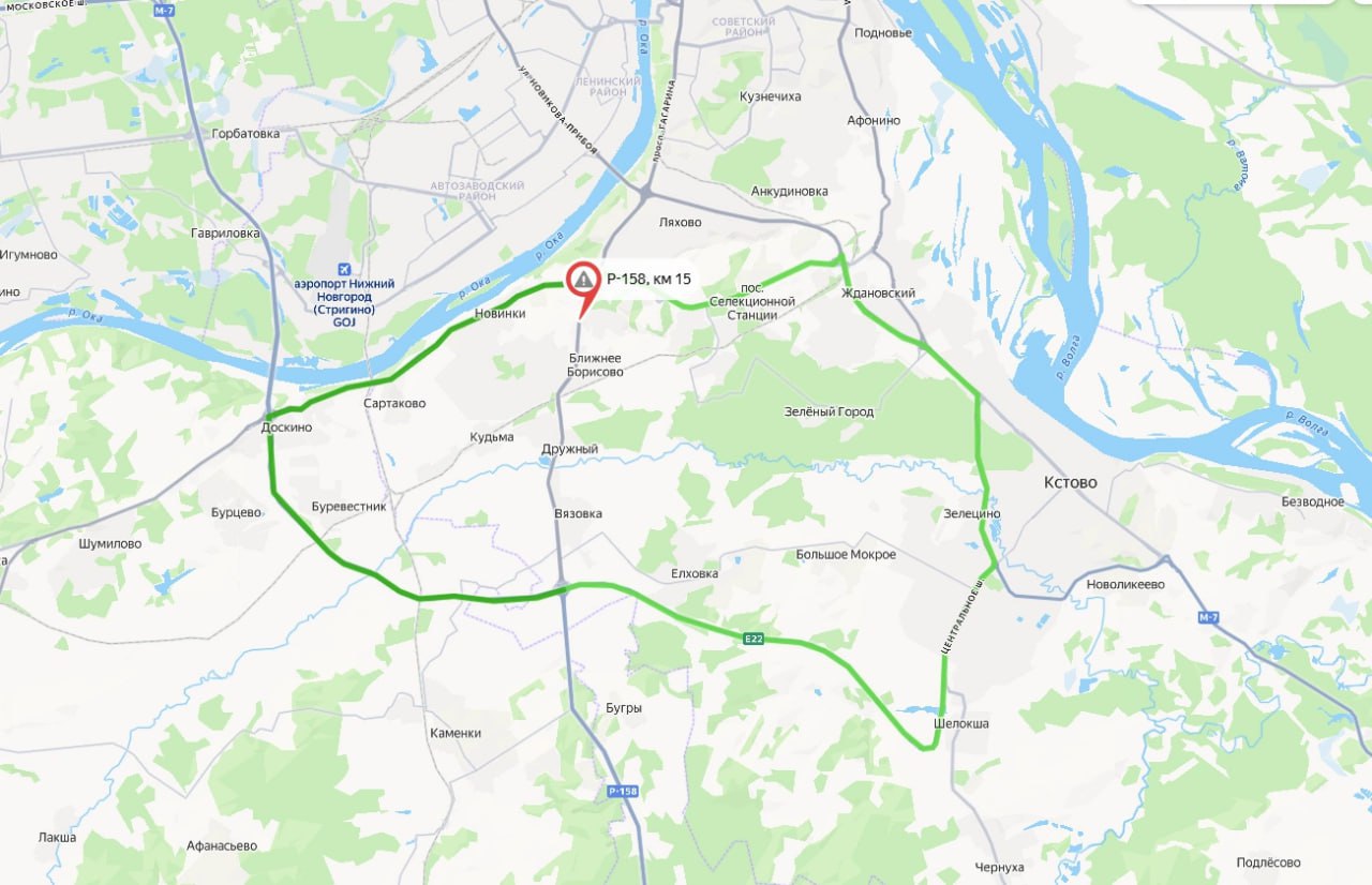 через Бешенцево, Ждановский, обход Кстово, Кстовскую промзону, обход Нижнего Новгорода.