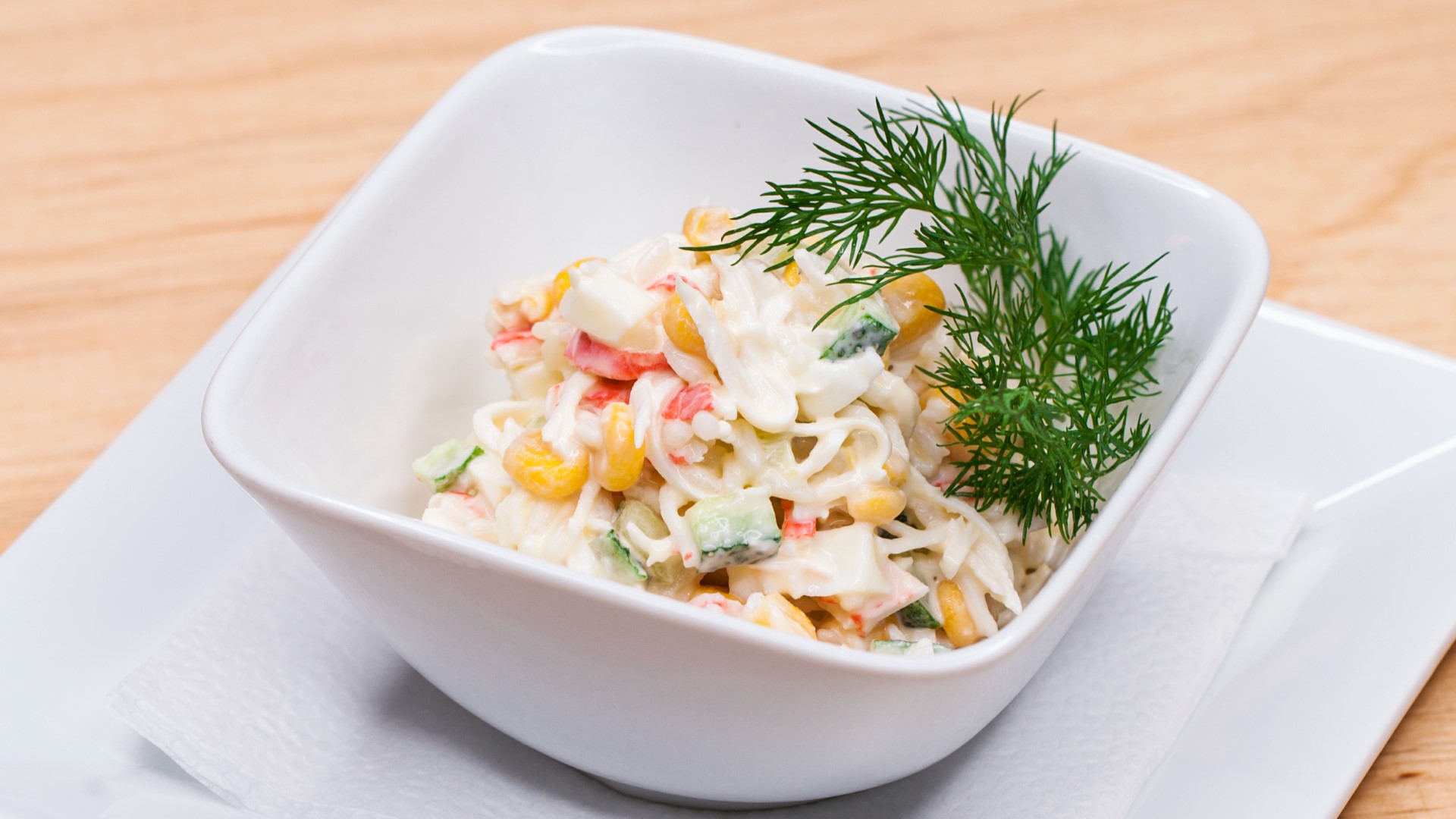 Затем добавляли кукурузу, все перемешивали. Поливали майонезом, посыпали зеленью и подавали салат к столу, пишет Дзен-канал «Правильно, готовим!».