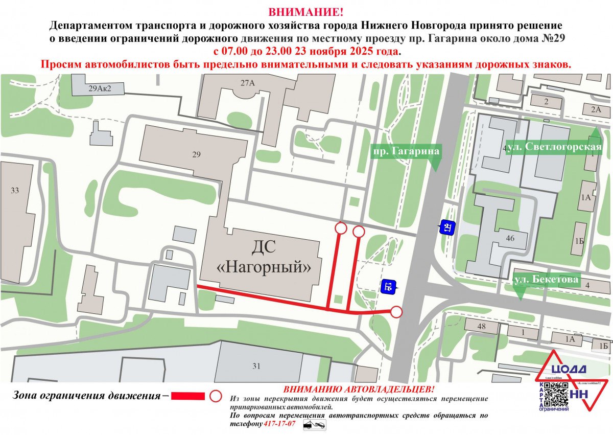 С 07:00 до 23:00 23 ноября будет ограничено движение транспорта по местному проезду проспекта Гагарина — около дома №29 в связи с проведением мероприятия, сообщает пресс-служба администрации Нижнего Новгорода.