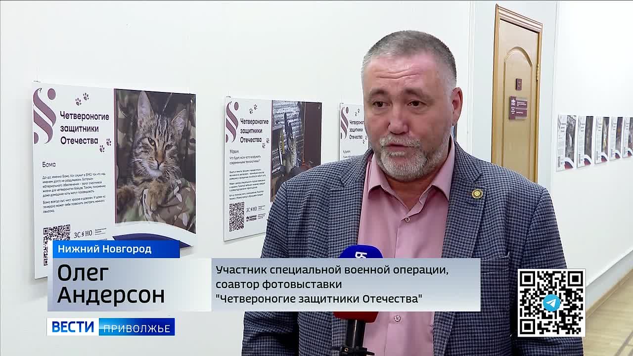 Первая в России фотовыставка, посвященная домашним животным в зоне военной спецоперации, открылась в Законодательном Собрании Нижегородской области. На выставке собраны 32 "портрета" фронтовых котов и собак. Автор большей части фотографий - сотрудник Заксобрания, участник спецоперации и волонтер Олег Андерсон.