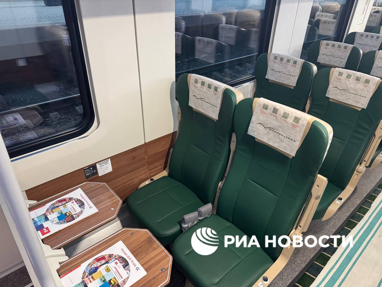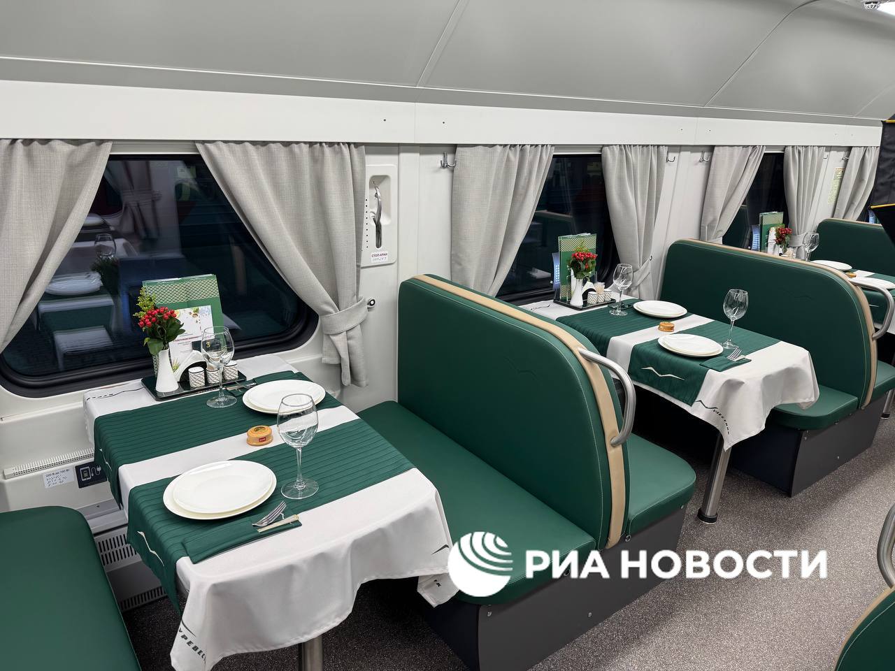Состав укомплектован современными двухэтажными вагонами стандартной и улучшенной компоновки, есть также купейный штабной вагон, СВ и вагон-бистро.