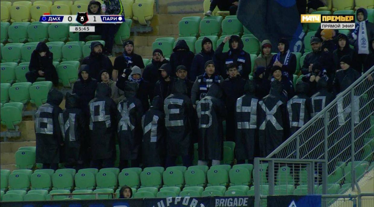 К отставке Биджиева призвали сегодня болельщики «Динамо». Группа фанатов в один из моментов встречи повернулась к полю спиной. У каждого из них на спине была нарисована буква, в результате чего сформировалась фраза «Биджиев уходи».