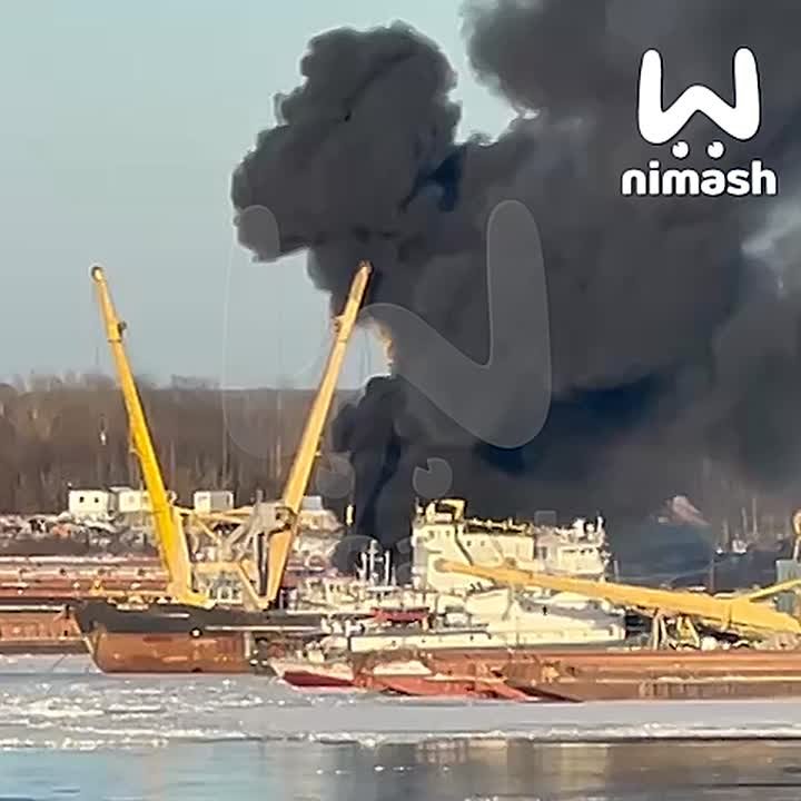 Крановое судно загорелось у Борского моста. Огонь может перекинуться на соседнюю установку.