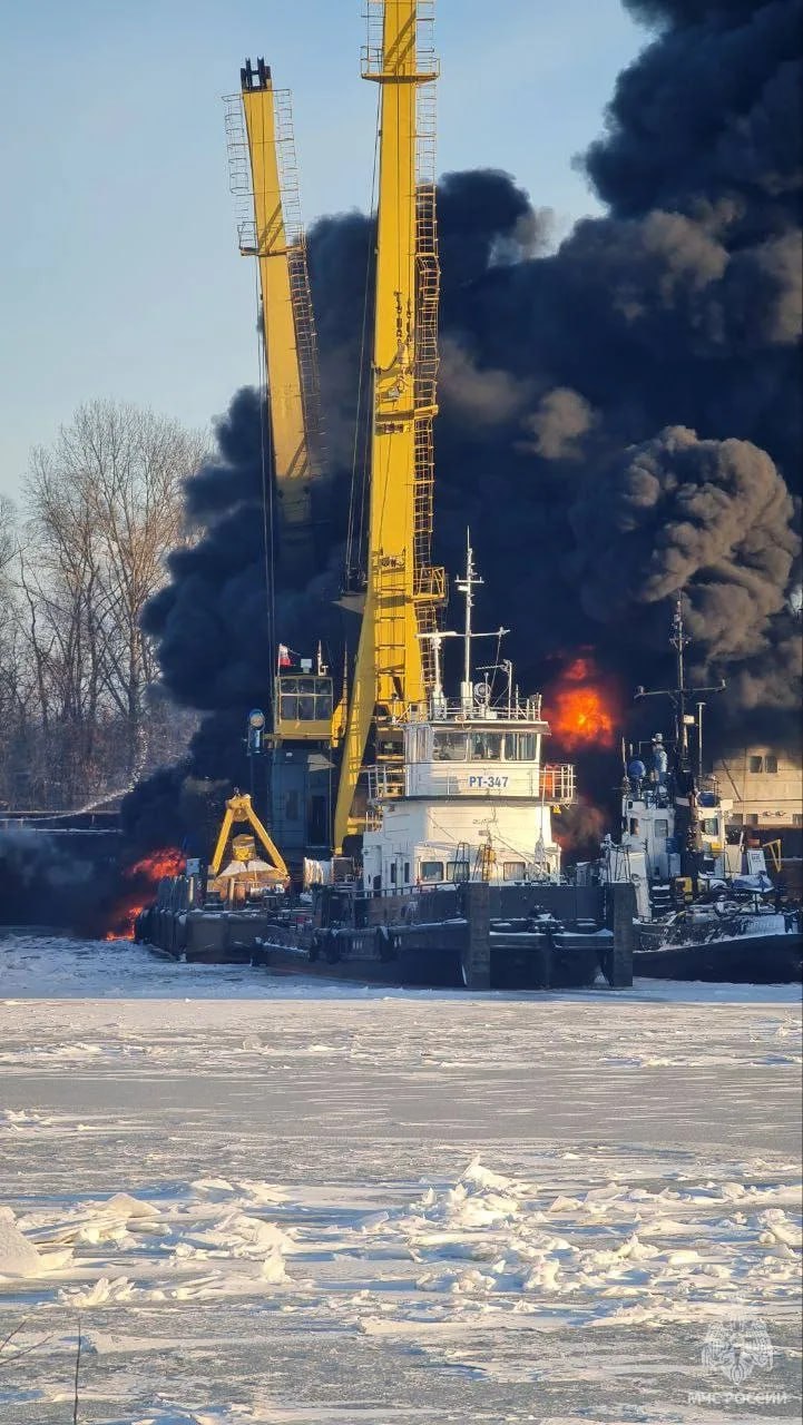 Загоревшийся плавкран продолжают тушить.