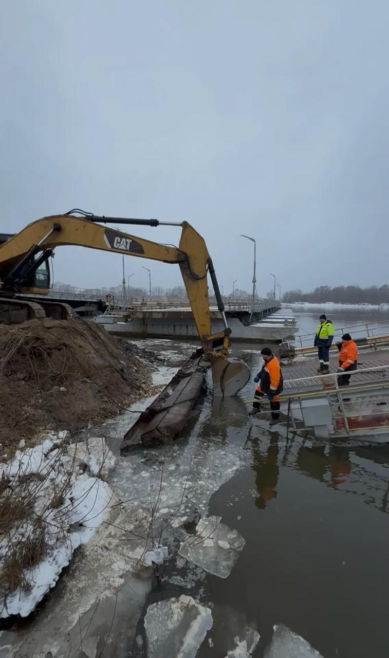 В Павловском округе продолжают восстанавливать конструкции наплавного моста, разрушенного из-за ледохода