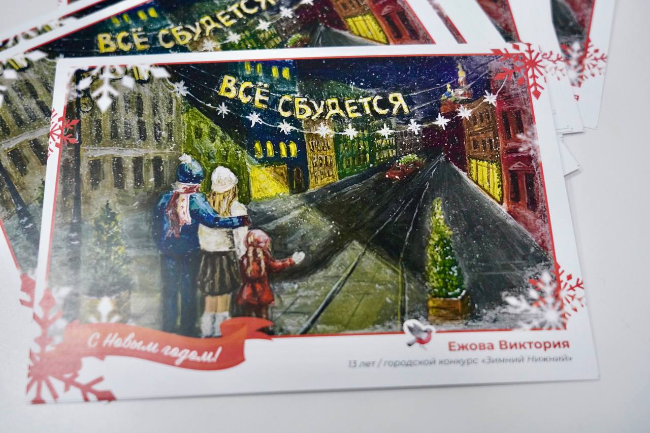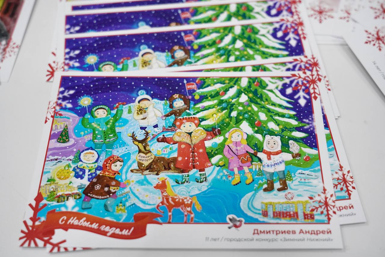 Яркие праздничные открытки с рисунками нижегородских школьников-победителей конкурса «Зимний Нижний» можно подписать и отправить через почтоматы в учреждениях культуры и торговых центрах.