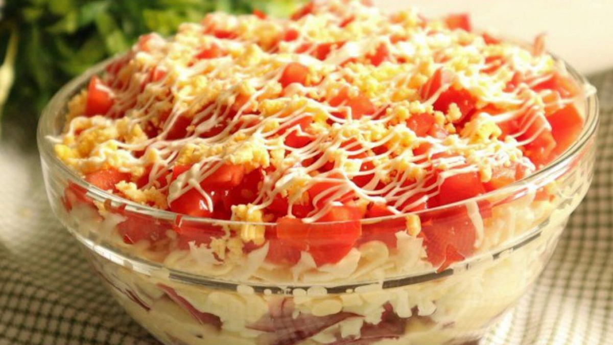 Нарезка и подготовка ингредиентов: Параллельно с маринованием, нарежьте помидоры на мелкие кубики, удаляя сердцевину, если они слишком сочные. Ветчину или ветчинную колбасу следует также нарезать маленькими кусочками. Яйца нужно отварить, остудить и разделить на белки и желтки: белки натереть на крупной терке, а желтки – на мелкой.