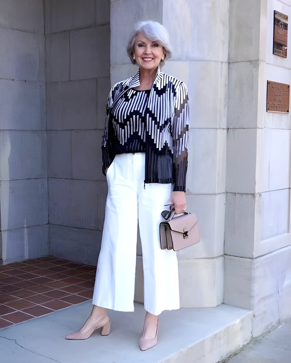 5. Строгая элегантность: Белые брюки со стрелками и блузка цвета сливочного масла подчеркивают зрелую элегантность. Легкая обувь нюдового оттенка добавляет образу комфорта.