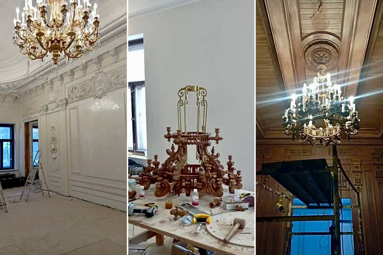 Подходят к концу работы в Дубовом зале: здесь собрана первая дубовая люстра, идёт золочение лепного декора. Реставрация лепнины выполнена на 94%, на столько же готов фасад с новыми отливами.