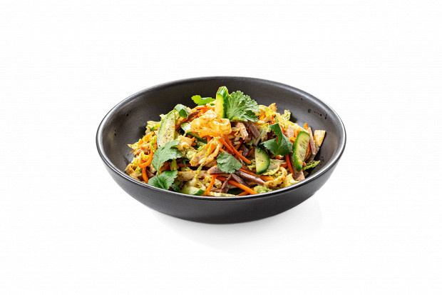 Салат, ставший настоящей кулинарной импровизацией, сочетает в себе, казалось бы, несовместимые ингредиенты: соленые огурцы и морковку по-корейски, блины и чили, а также отварной говяжий язык с пекинской капустой. Необычные текстуры и вкусы закольцовываются тонким терпко-кисло-солено-сладким соусом, который напоминает тайскую кухню и щедро нагружен умами.