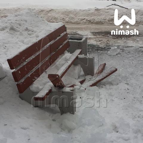 Гигантская сосуля раздолбала лавочку у дома на Козицкого.