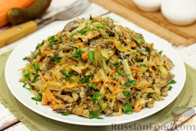 - Салат с печенью, морковью и огурцами: Этот салат объединяет жареную куриную печень с ярким вкусом свежих овощей. Для его приготовления потребуются солёные огурцы и обжаренные лук с морковью, что делает блюдо не только сытным, но и очень аппетитным.