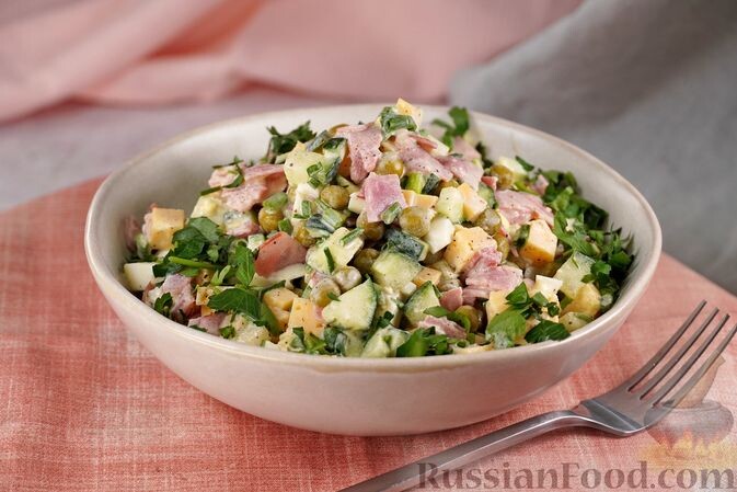 - Салат с ветчиной, огурцами и горошком: Легкий и сытный, этот салат станет отличным дополнением к любому столу.