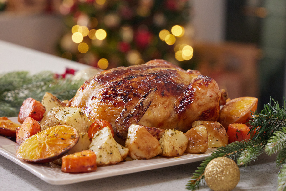 В миске растопите сливочное масло, добавив мелко нарезанный чеснок и цедру одного апельсина. Мелко нарежьте 10 г розмарина и добавьте в масло. Всё хорошо перемешайте с приправой.Курицу необходимо посолить и поперчить, затем аккуратно отделить кожу от филе грудки, чтобы создать кармашки для масла.Нарежьте половину апельсина и насыпьте его в курицу. Для надежности соедините ножки курицы крест-накрест, продев их в сделанные надрезы.Остальные апельсины нарежьте кружочками и выложите их на противень в качестве основы. Затем поместите курицу сверху и сбрызните подсолнечным маслом.Готовьте курицу в заранее разогретой до 170 градусов духовке в течение 45 минут.Выжмите сок из одного апельсина в сотейник, нагрейте до кипения и выпарите до состояния глейзера.Очистите корень сельдерея и нарежьте его, а морковь порежьте кругами. Смешайте овощи с маслом и розмарином, посолите и поперчите.Через 45 минут, вытащите курицу из духовки и добавьте гарнир. Накройте грудку фольгой, чтобы она не пересушилась.После этого верните противень в духовку ещё на 30 минут, увеличив температуру до 175-180 градусов.За 15 минут до готовности откройте фольгу и смажьте курицу апельсиновым глейзером.Дайте готовой курице отдохнуть 15 минут, затем подавайте на стол с овощами и соком из противня.Приятного аппетита!