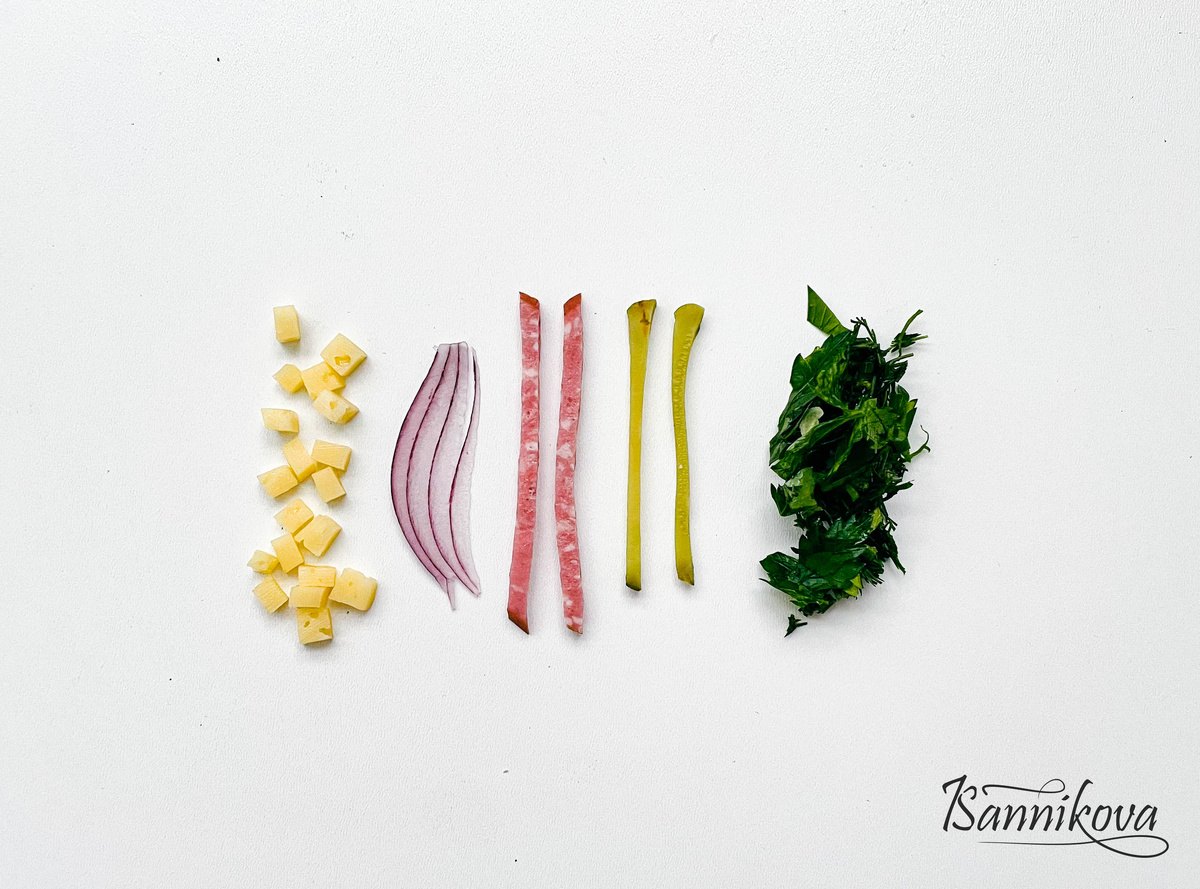 Коллекция привычных ингредиентов заиграла новым светом, когда в процессе приготовления стал заметен эффект простого баланса: яркость лука и кислинка уксуса соединяются с нежной основой из сметаны и майонеза, пока кусочки сыра и огурцов добавляют текстуру и сытность.