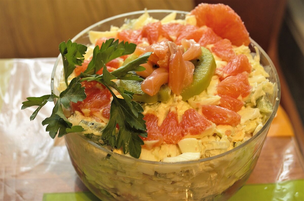 Этот салат идёт как раз по такому формату: два слоя чистых вкусов, свежие ингредиенты и минимальная суета. Нижний слой соединяет рыбу, помидоры и огурец с укропом и киви, над ним яйца и пекинская капуста, скреплённые лёгкой майонезной прослойкой. Весь процесс подчинён одному ощущению: готово быстро, вкусно и празднично.